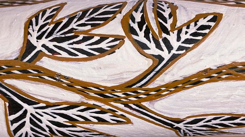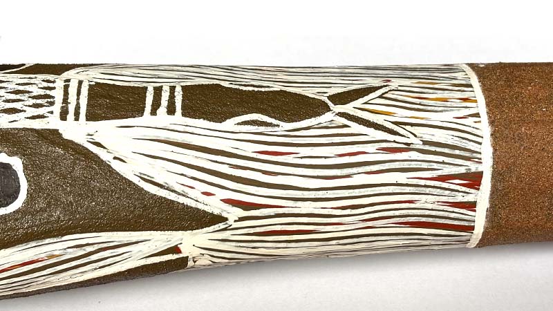 砂を混ぜこんで立体的にサギと蝶、そして他で見る事のできないMadarrpaクラン特有の神聖なパターンが描かれたクラン・リーダーDjambawa Marawiliの貴重な2012年作のイダキ。[Used扱い] |